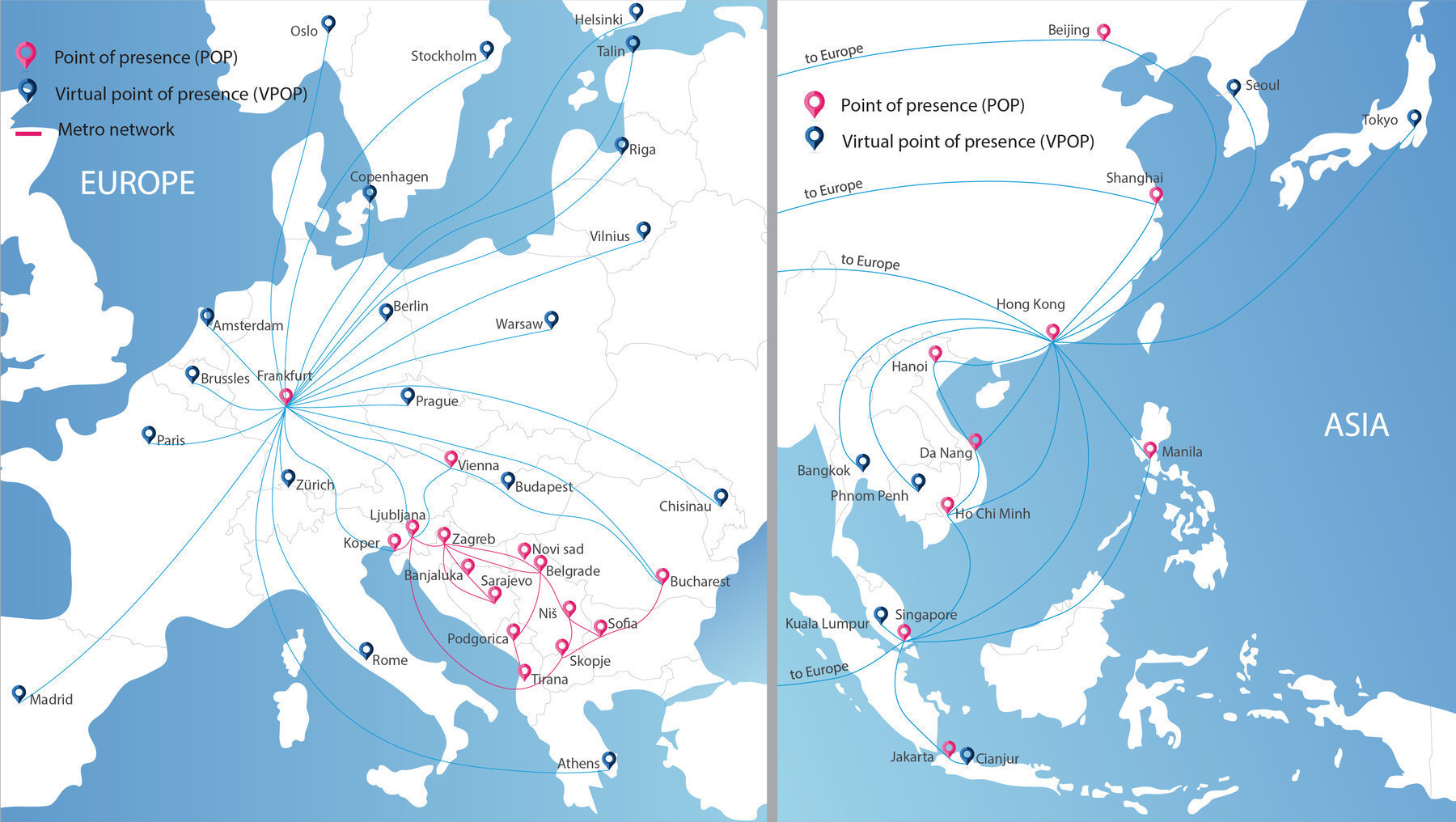 Designul retelei noastre permite o acoperire mare a regiunii. Pe langa conexiunile internationale, avem retele nationale proprii, care ne permit sa acoperim si orase mai mici. Intre PoP-urile principale am construit conexiuni mai puternice iar pentru latente reduse avem peste 200 de interconexiuni in VIX, DE-CIX, SIX si CIX.